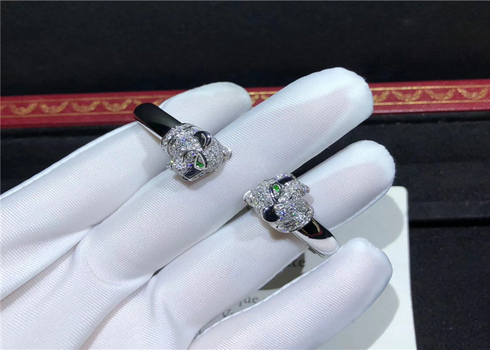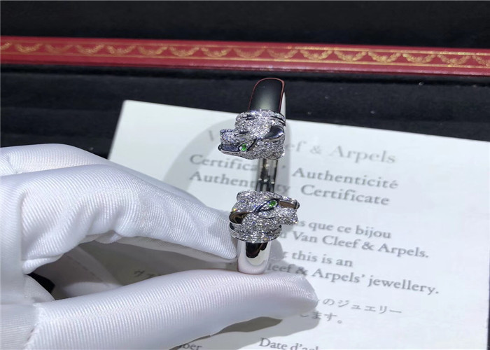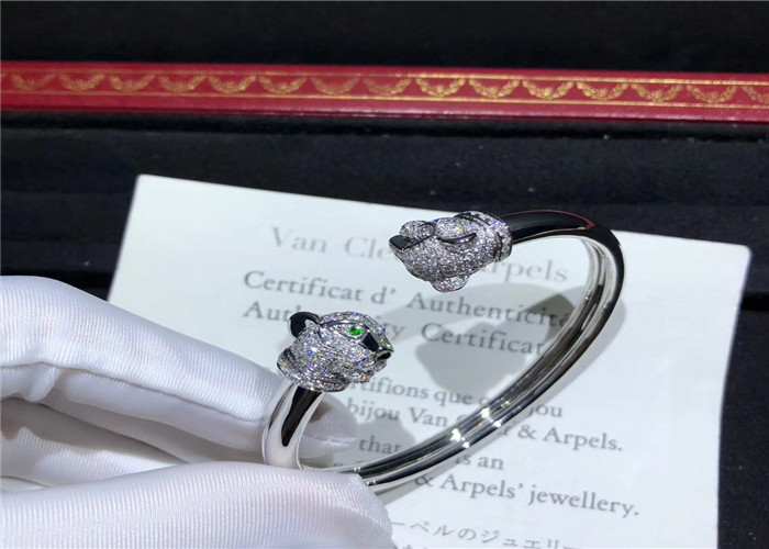 سوار بانثير رقم: N6706217 تفاصيل العمل سوار بانثير دي كارتييه في الذهب الأبيض 18 كارت مع 194 جولة من الماس اللامع (1.37 قيراط) ، الزمرد والأنيكس.