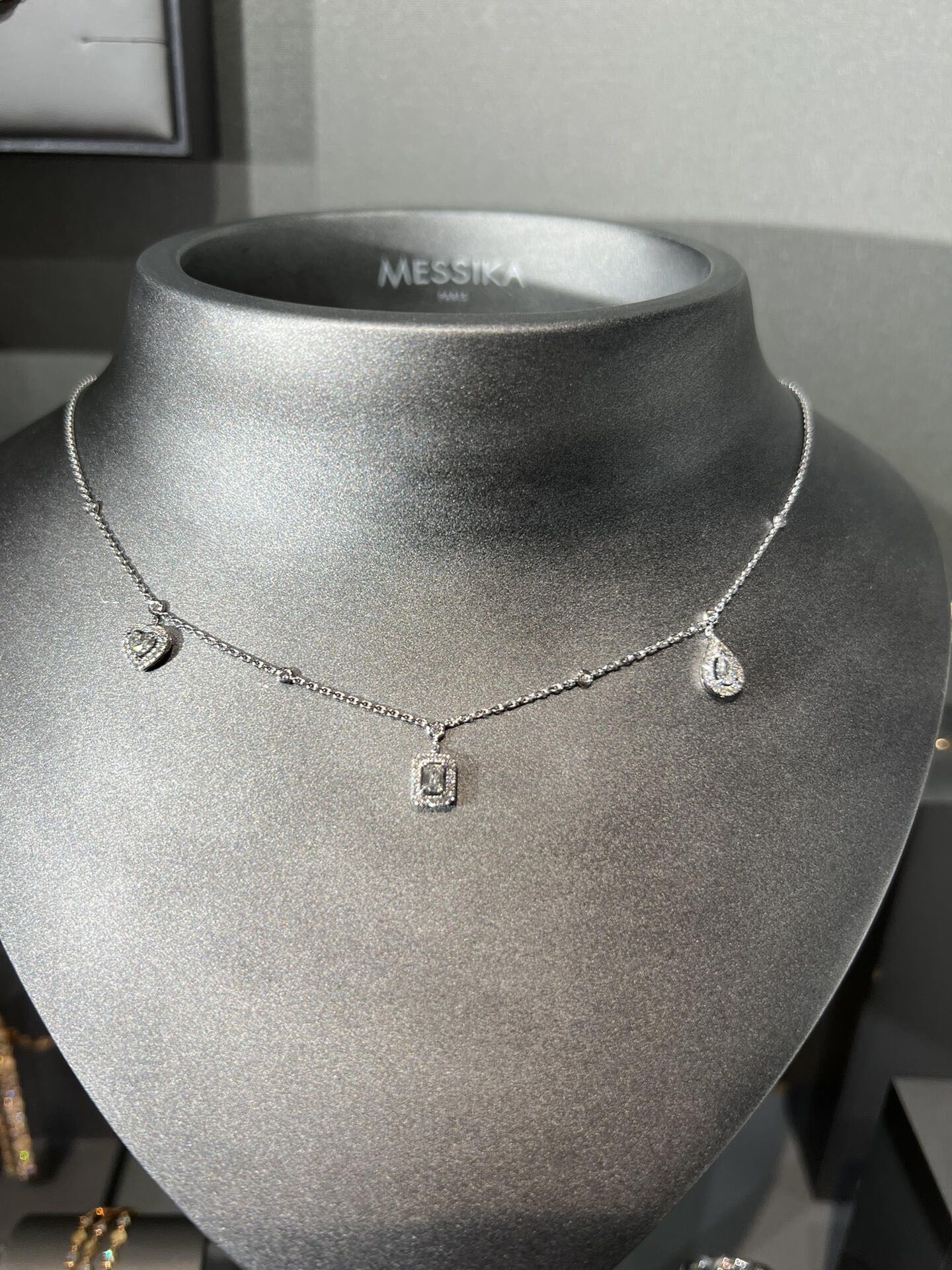 الماس في هذه القلادة وضعت في إعداد مؤخرة، والتي تشتهر بأنها عقدة آمنة والقدرة على السماح بأقصى قدر من الضوء يمر من خلال الماس للحصول على اللمعان النهائي واللمع.إعداد المسامير يسمح أيضاً لكل ماسة أن تُعرض بشكل فردي، خلق مظهر جميل وفريد.